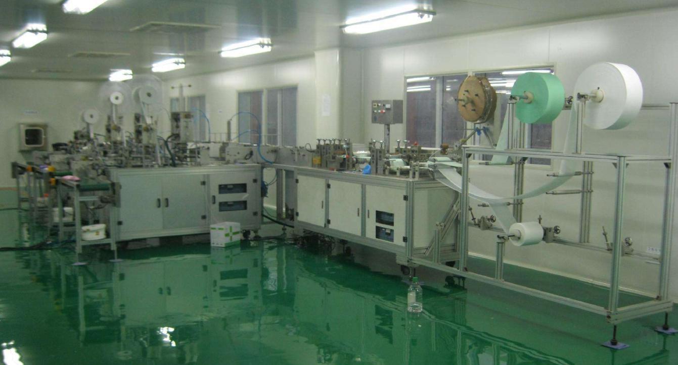 一、设备介绍: 主要用于平面式口罩自动成型:整卷布料放卷后经过滚轮驱动,布料通过自动折边、包边;鼻梁条整卷牵引开卷,定长裁切后导入至包边布料中,双边通过超声焊接至封口,再经过超声侧向封口,通过切刀裁切成型;通过流水线将口罩输送至两个口罩耳带熔接工位,通过超声焊接最终口罩成型;当口罩制成后,通过流水线输送至平带线收集。 二、设备安装与配置需求: 设备尺寸:约6500mm(L)×4500mm(W)×1900mm(H); 设备重量:≤5000kg,地面承重≤500KG/m2; 工作电源:设备 220VAC±5﹪,50HZ,额定功率约 9KW; 压缩空气:0.5~0.7 MPa,使用流量约 300L/min; 使用环境:温度 10~35℃、湿度 5-35%HR,无可燃性、腐蚀性气体,无粉尘(洁净度不低于 10 万级)。 三、设备的生产能力: 生产效率: 80-120ppm; 设备生产合格率:99%(来料不满足要求、员工不当操作除外时) 设备故障率:2%(指设备自身所产生的故障) 四、生产规格: 标准型:175*95mm 五、设备的主要组成结构 1 SS 外层无纺布/过滤无纺布/SS 内层无纺布放卷机构 3 套 2 鼻梁条放卷机构 1 套 4 鼻梁条驱动、裁切机构 1 套 宽度 3-7mm 5 布料折边机构 1 套 6 滚焊封边机构 1 套 双边 8 布料扇折机构 2 套 9 滚焊侧缝机构 1 套 10 滚封机构 1 11 转运流水线 1 条 12 分流机构 1 套 13 耳带焊机机构 1 套 14 下料流水线 1 条 15 操作系统 1 套 16 操作面板 1 套